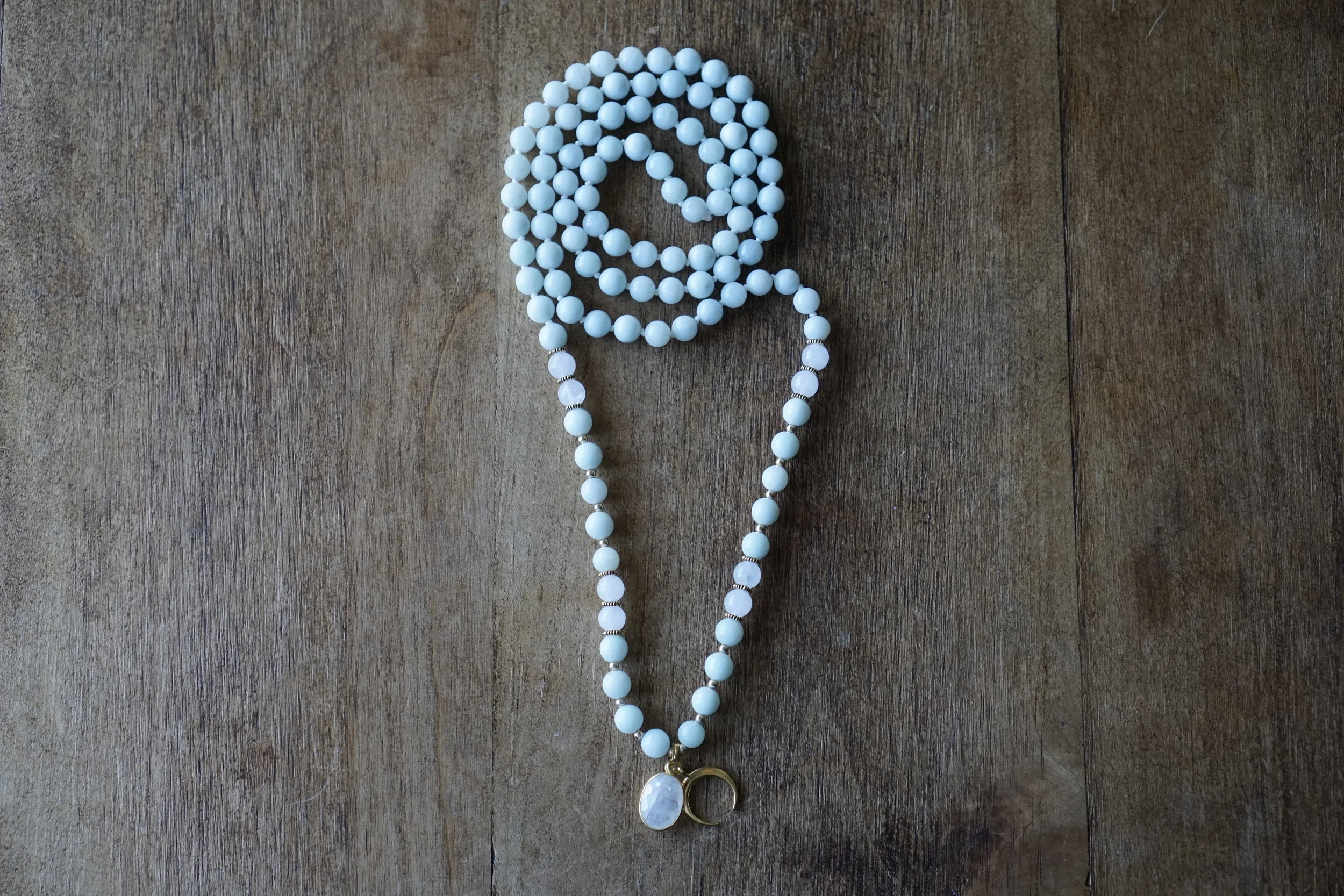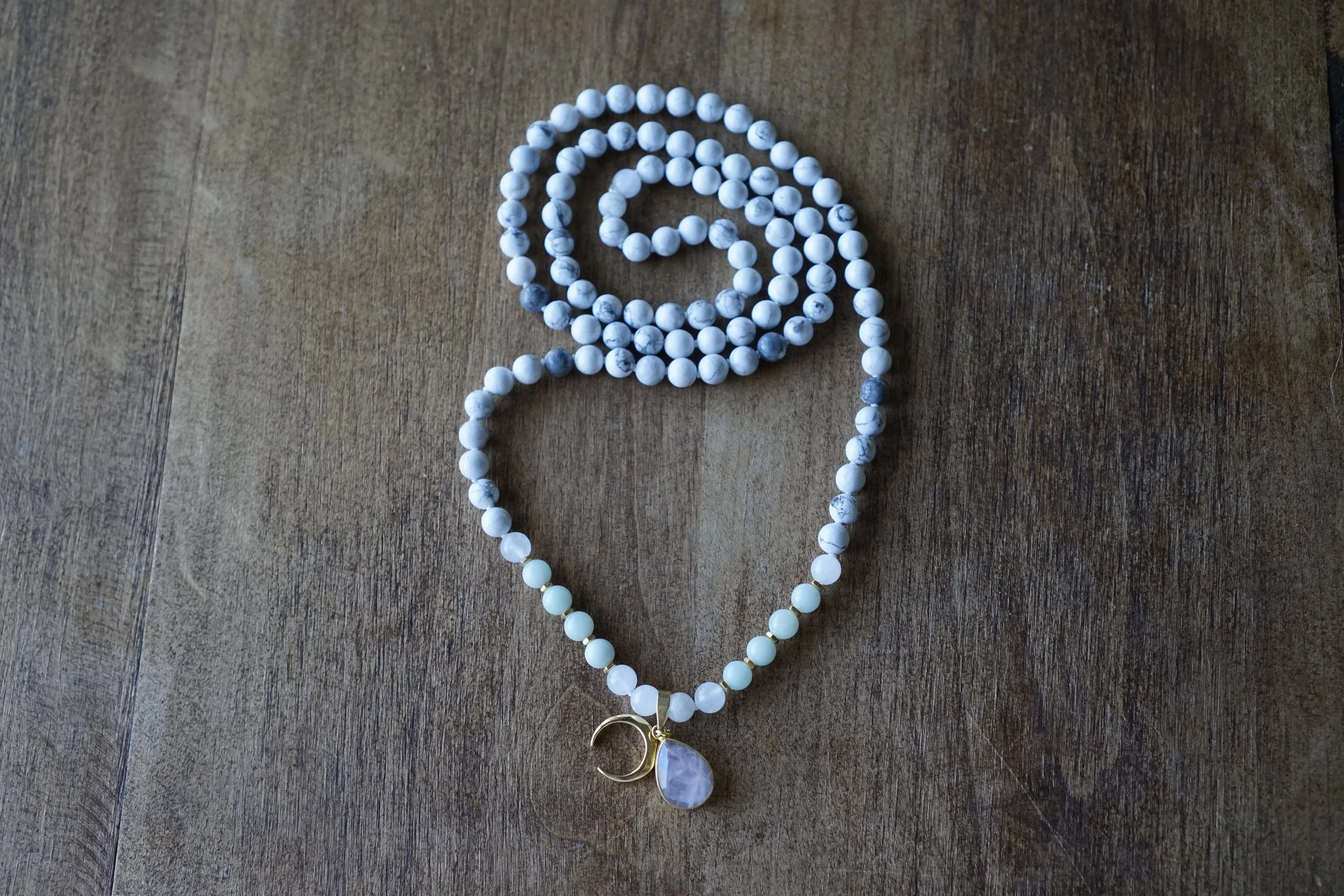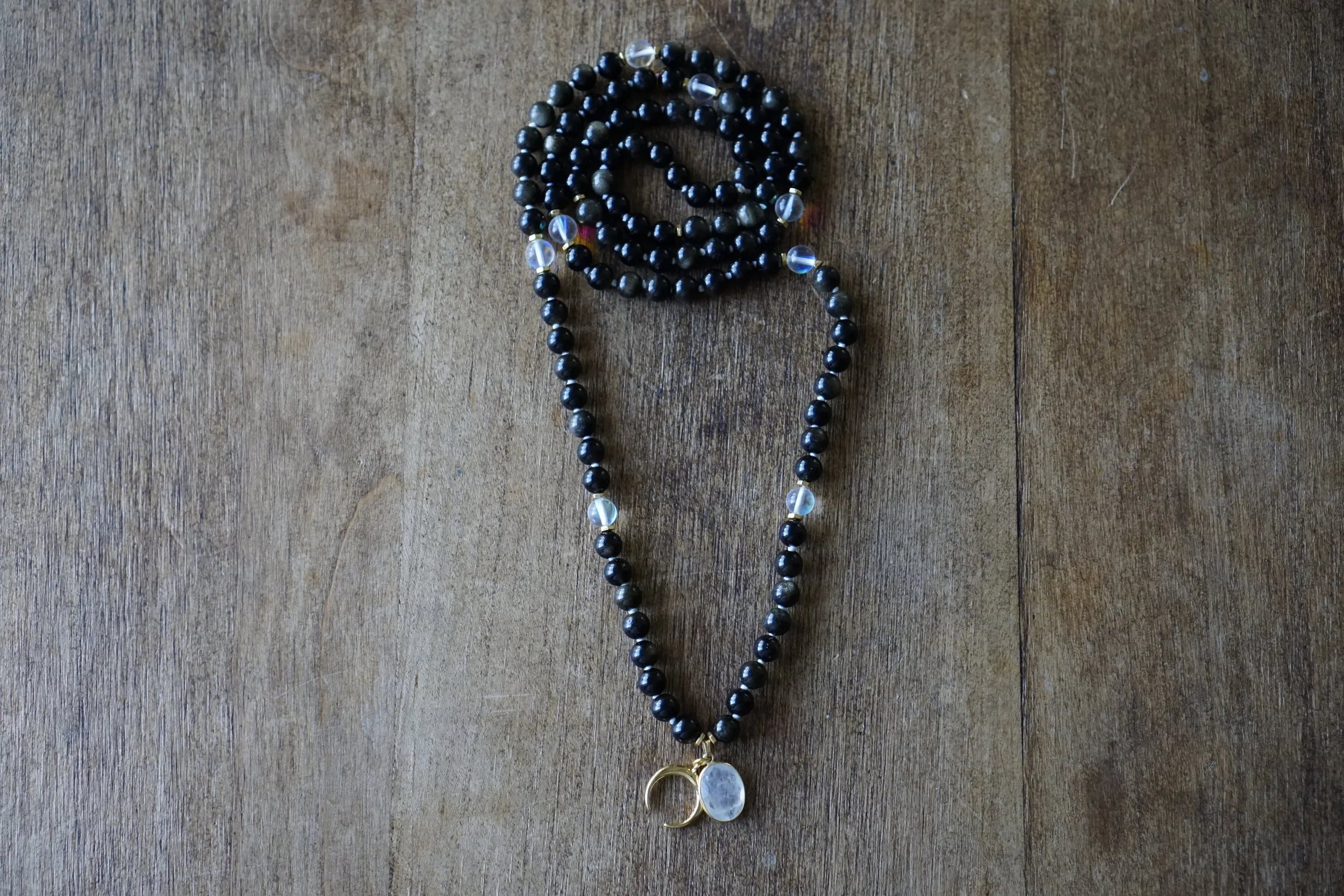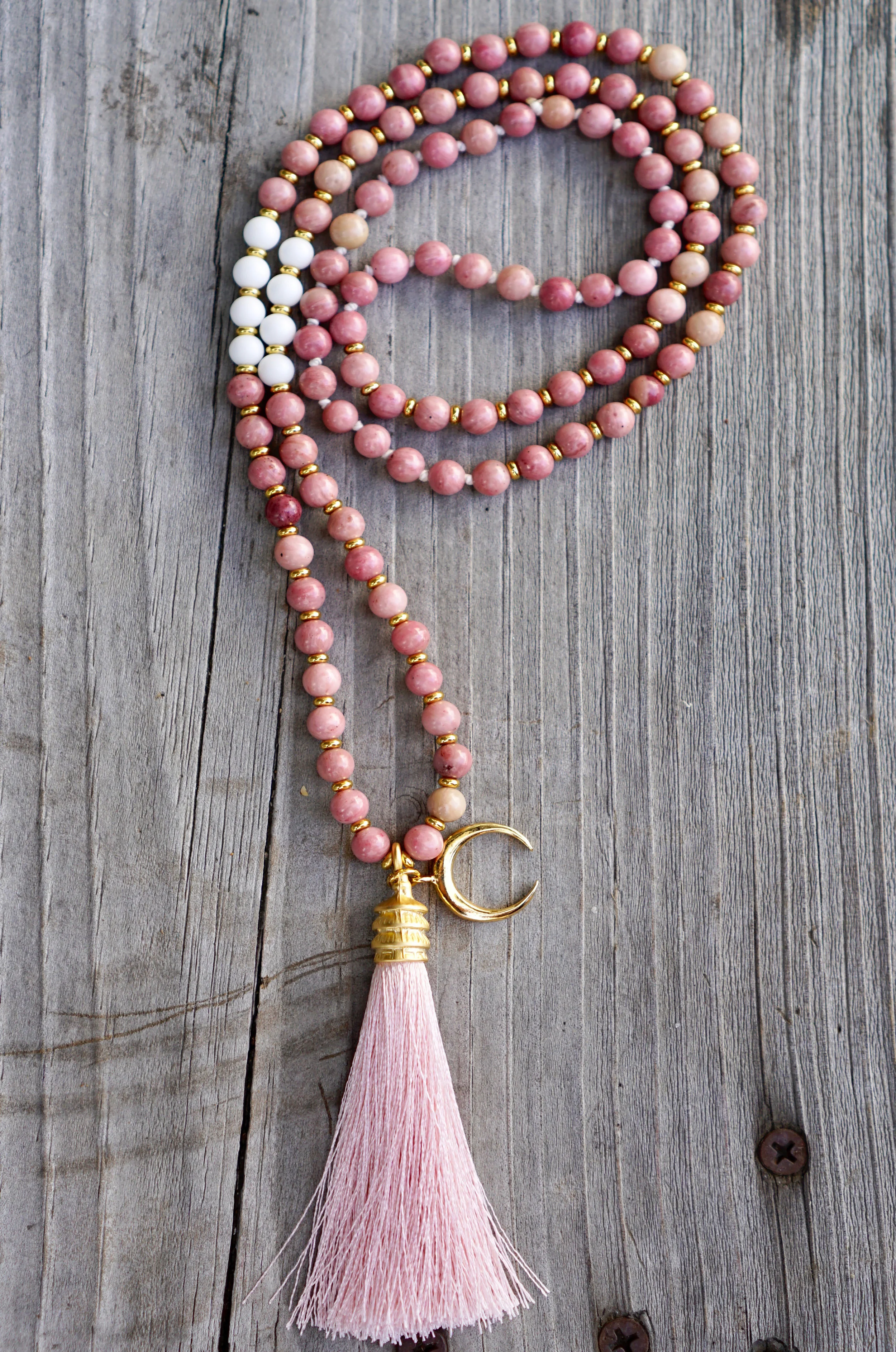 ☽☽Moon Malas☾☾ are handcrafted, unique malas made in southern California. Each mala is made with quality gemstones that are sourced from within the artist community. All Moon Malas are one of a kind and are purposefully designed with the individual qualities of the gemstones in mind. Crescent Moons are a feminine symbol, universally representing the rhythm of time as it embodies the cycle. The word “crescent” comes from the Latin term ceres meaning to “bring forth, create” and crescere, the Latin term for “grow, thrive”. We hope one of these 108 bead malas becomes a beautiful way to add intention and mindfulness into your life.