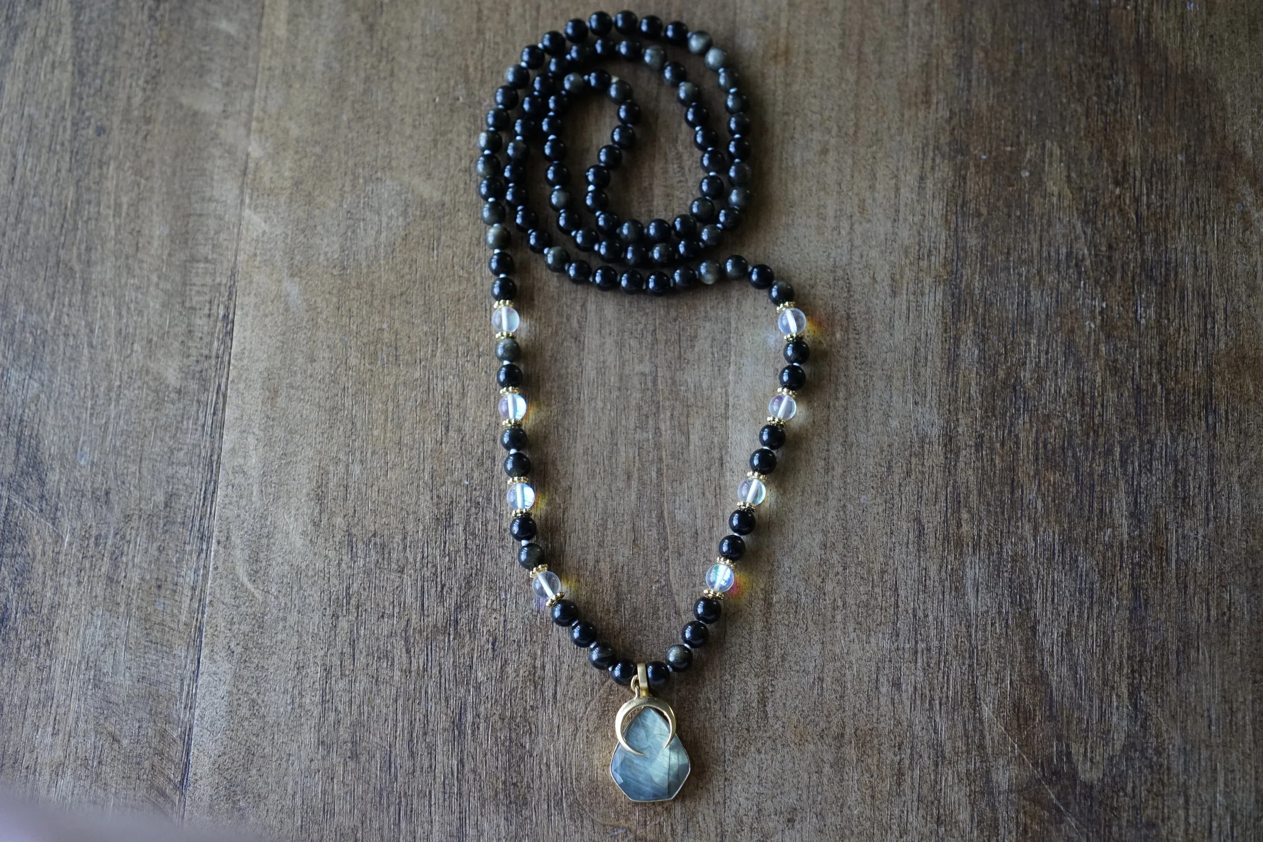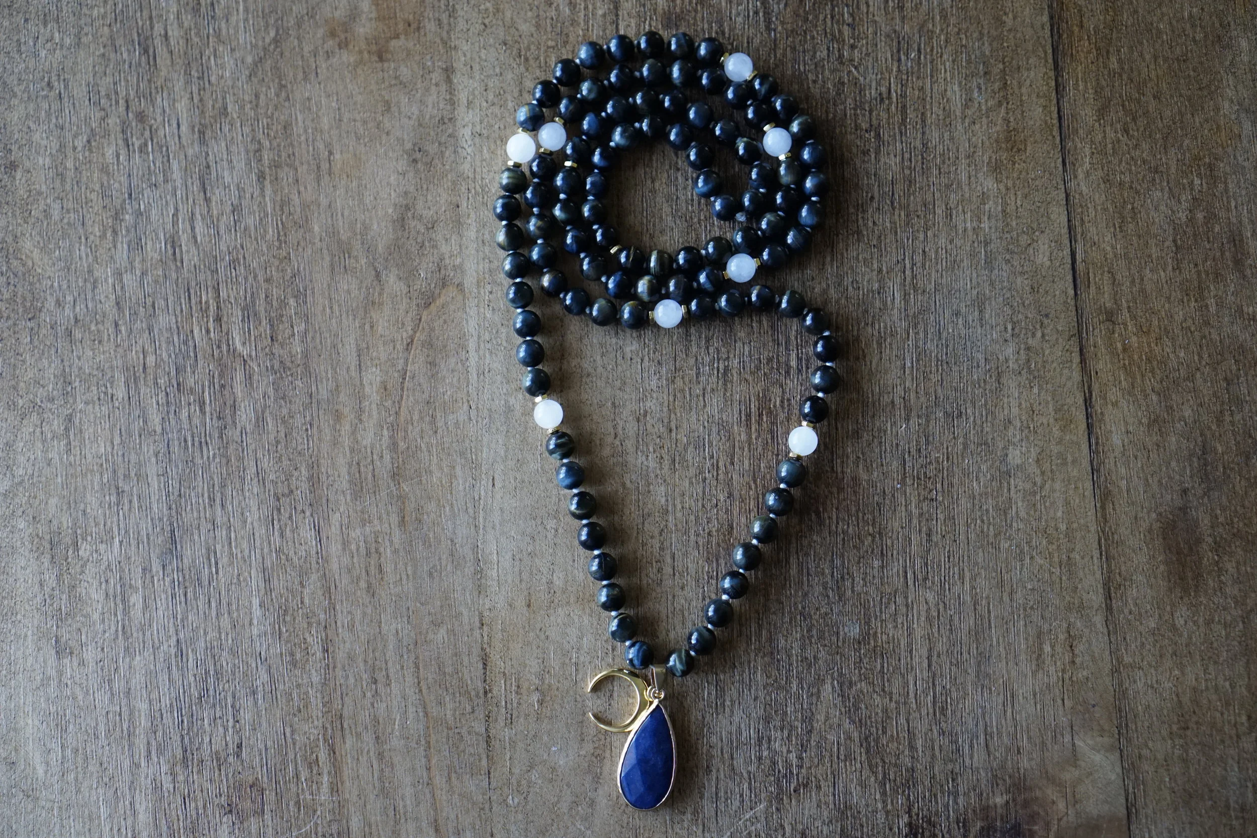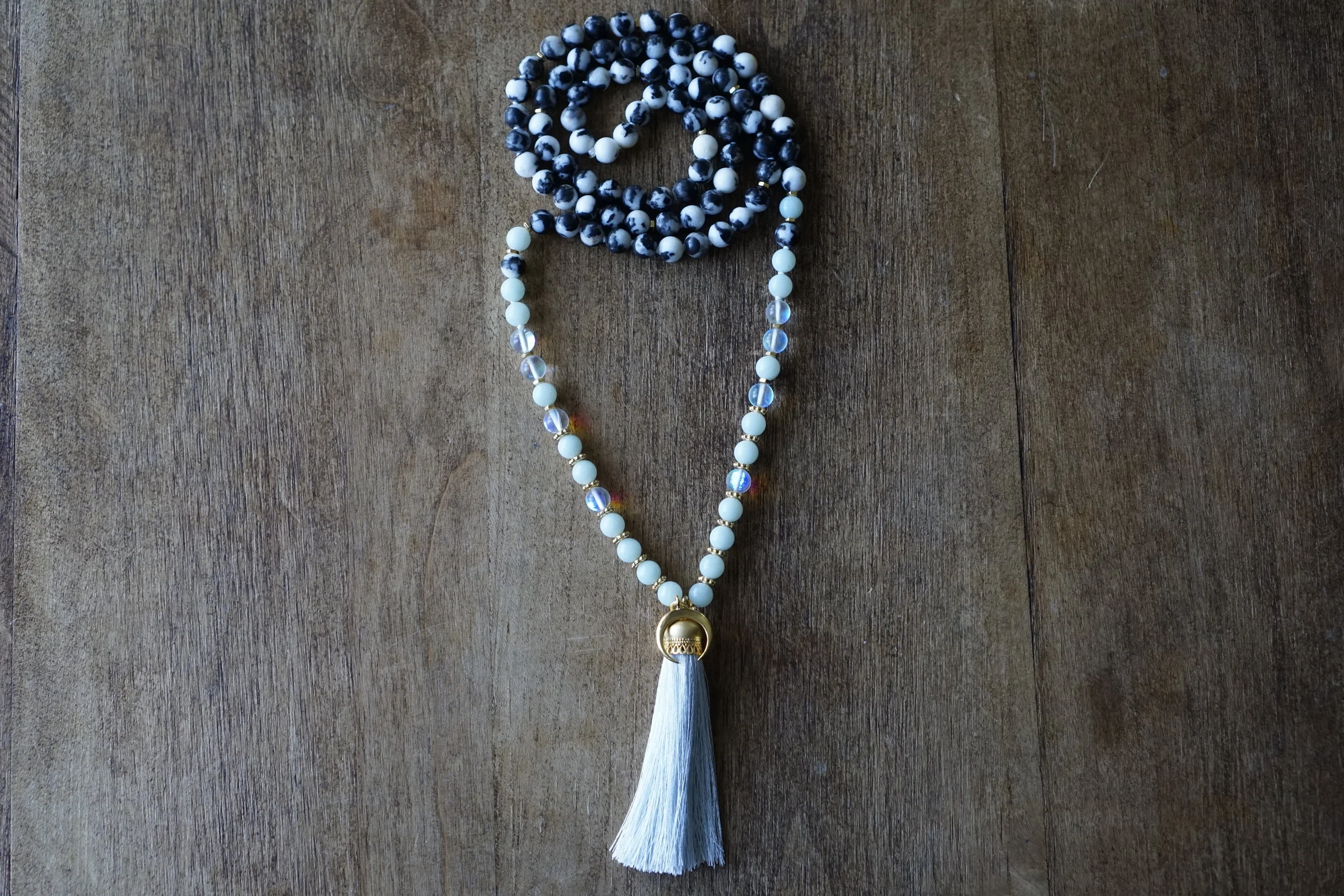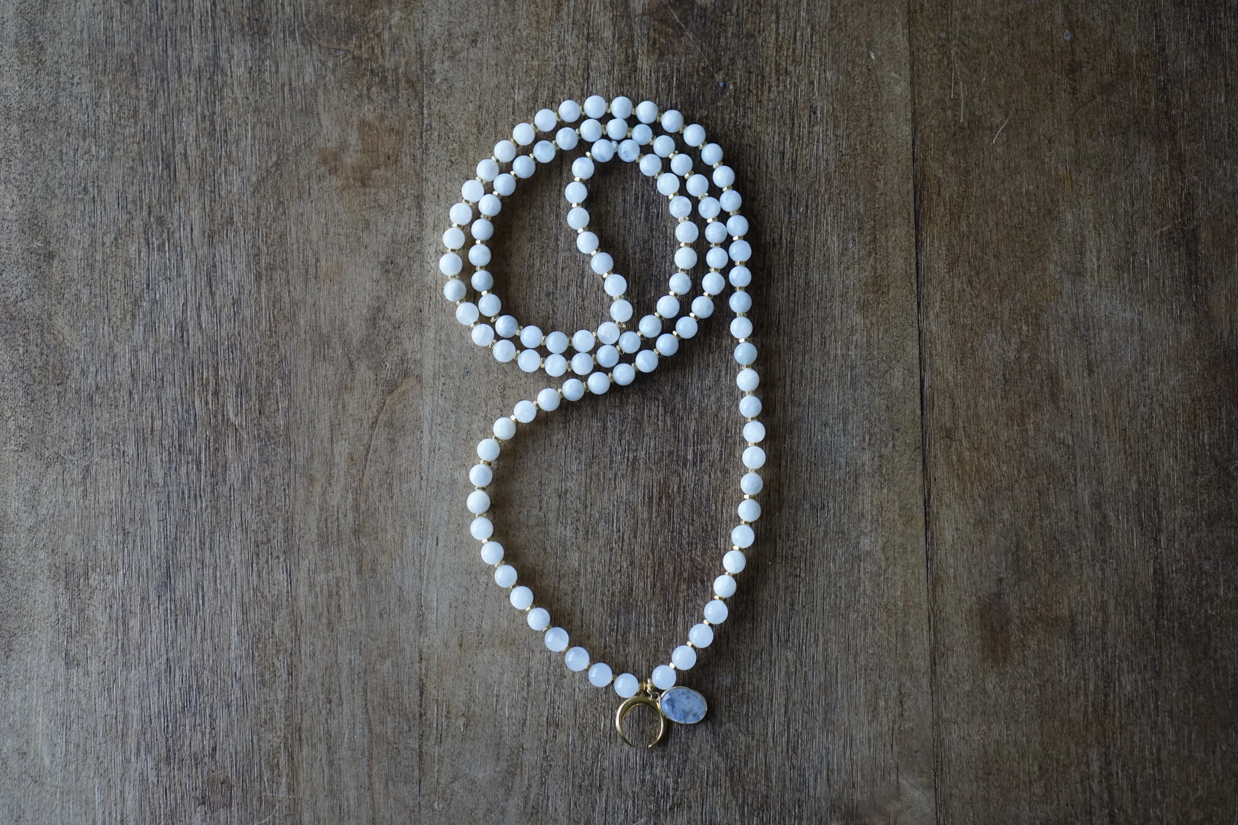 ☽☽Moon Malas☾☾ are handcrafted, unique malas made in southern California. Each mala is made with quality gemstones that are sourced from within the artist community. All Moon Malas are one of a kind and are purposefully designed with the individual qualities of the gemstones in mind. Crescent Moons are a feminine symbol, universally representing the rhythm of time as it embodies the cycle. The word “crescent” comes from the Latin term ceres meaning to “bring forth, create” and crescere, the Latin term for “grow, thrive”. We hope one of these 108 bead malas becomes a beautiful way to add intention and mindfulness into your life.